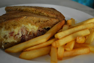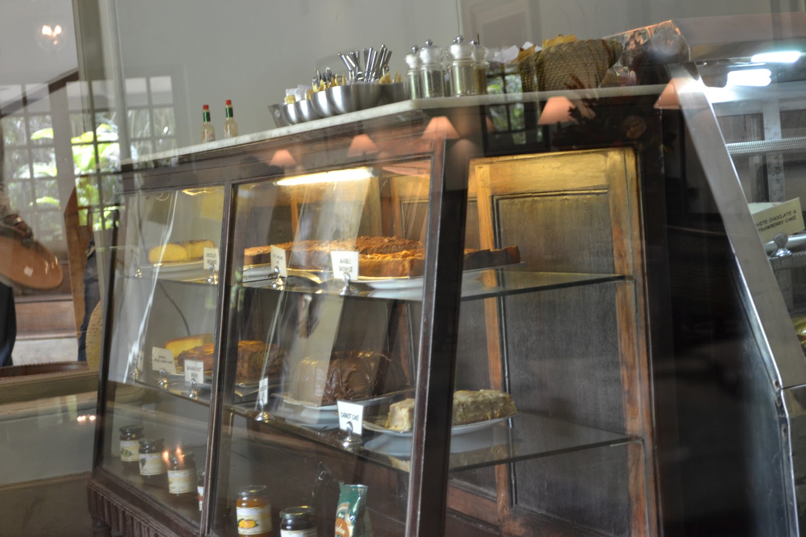 This is a quaint little place with checkered floors and old colonial furniture strewn here and there. We ordered a slice of cheesecake, a smoked bacon sandwich and a cold coffee drink.