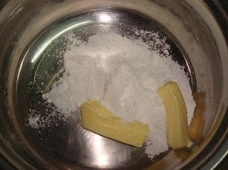 The rest of the sugar and the 40 gms of butter go into another bowl.