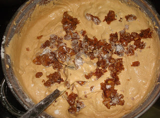 Now sprinkle some of the maida over the chopped fruits and nuts, and just mix it around with a spoon. Add them to the batter and gently fold everything in with a long spoon. [I had soaked a few chopped nuts and dried fruits in brandy for a month, to make the Christmas cake. Just sprinkle some of the maida over this and add it to the batter.]