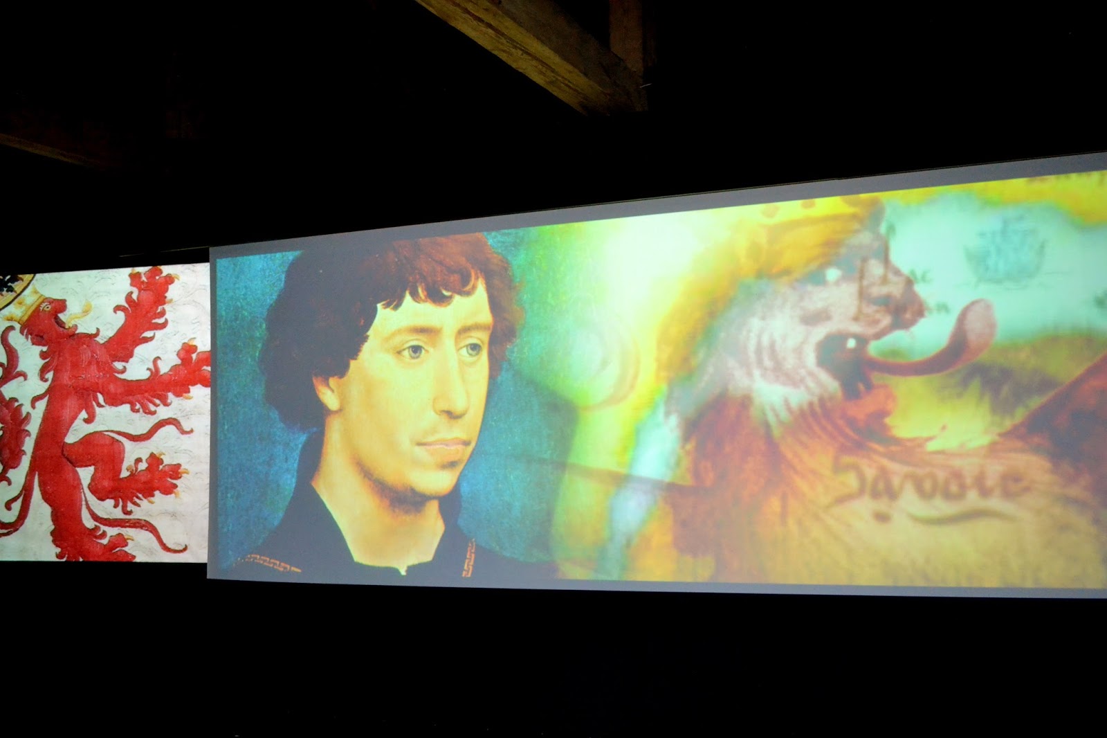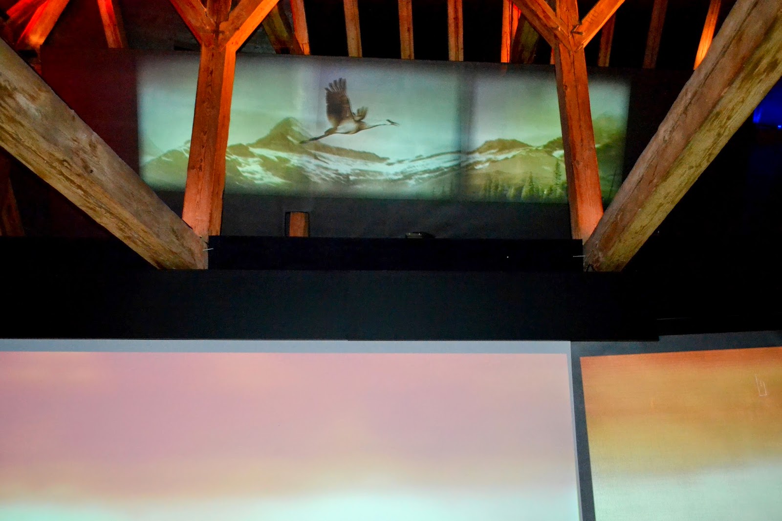 So we entered the castle and the girl at the reception asked us if we wanted to see a short presentation about the castle, and she took us into this small room and this crane is seen flying above us… apparently long long ago, a very handsome prince (he was quite dashing in the presentation) was riding around and he came across this undiscovered hill. It was twilight and the setting sun cast a reddish hue over the beautiful landscape and as the prince stood watching a lone crane slowly soared into the red dusky sky. The french word for crane is ‘grue’ and that’s how this place got it’s name and their symbol is a crane in a red background.