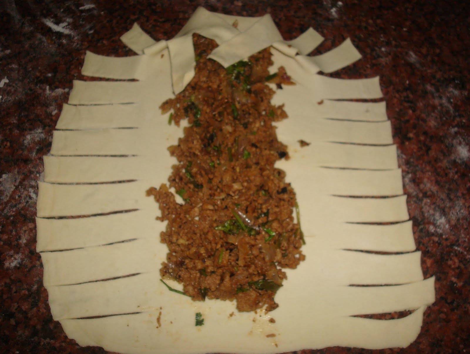 So this is the ready made dough, remove it from the freezer a few hours before you start with the process. Now move on to your filling, I used three types of filling here… a vegetable one, a minced beef filling and a cheesy mushroom filling.