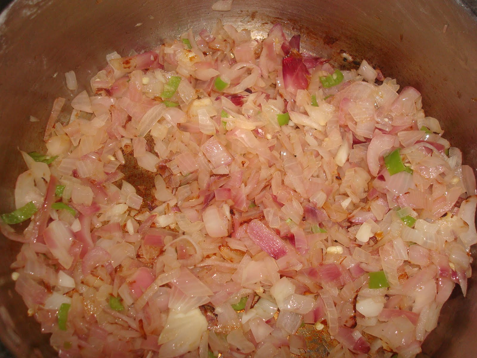 For the vegetable filling I used only capsicums and potatoes. First you saute onions and green chillies till they turn translucent.