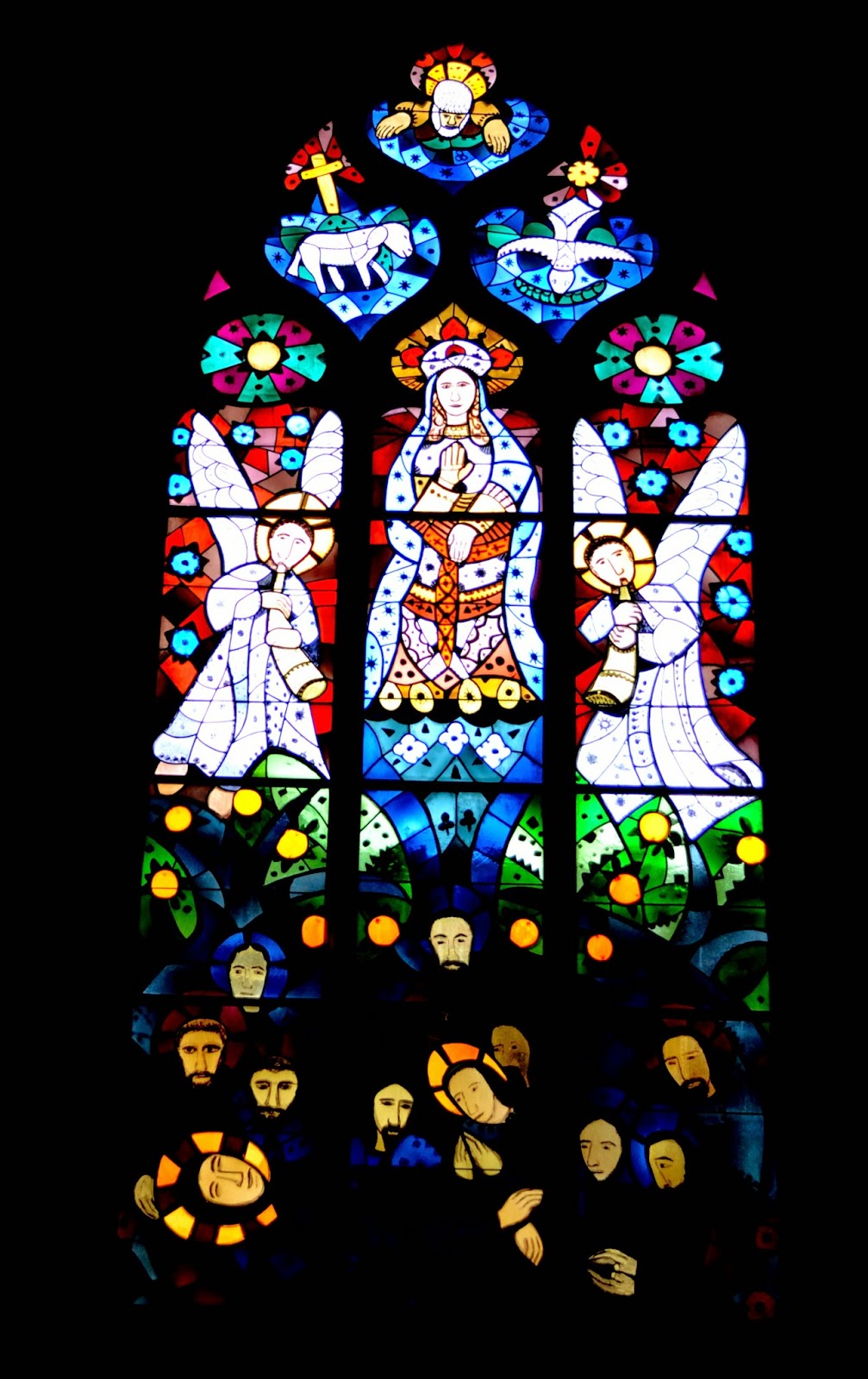 A stained glass window… depicting the Assumption of Mary.