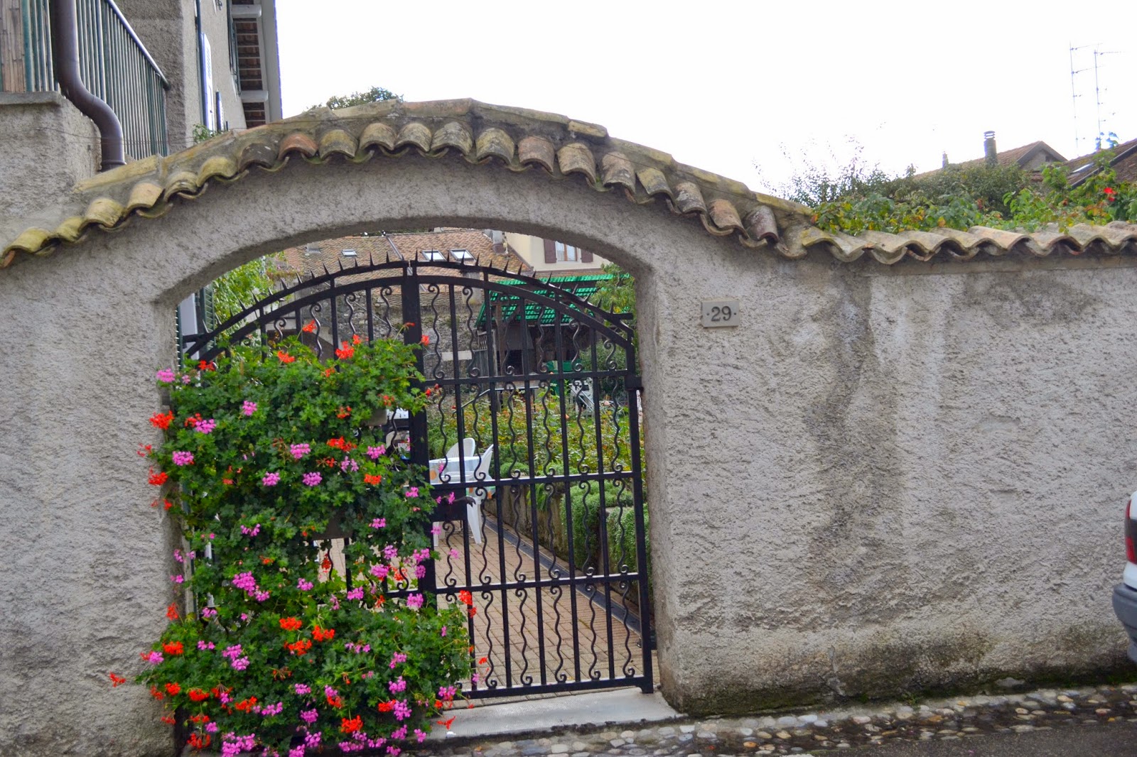 Another instance where people try to grow flowers anywhere and everywhere they can…. here you see two window boxes hanging from one half of a gate.