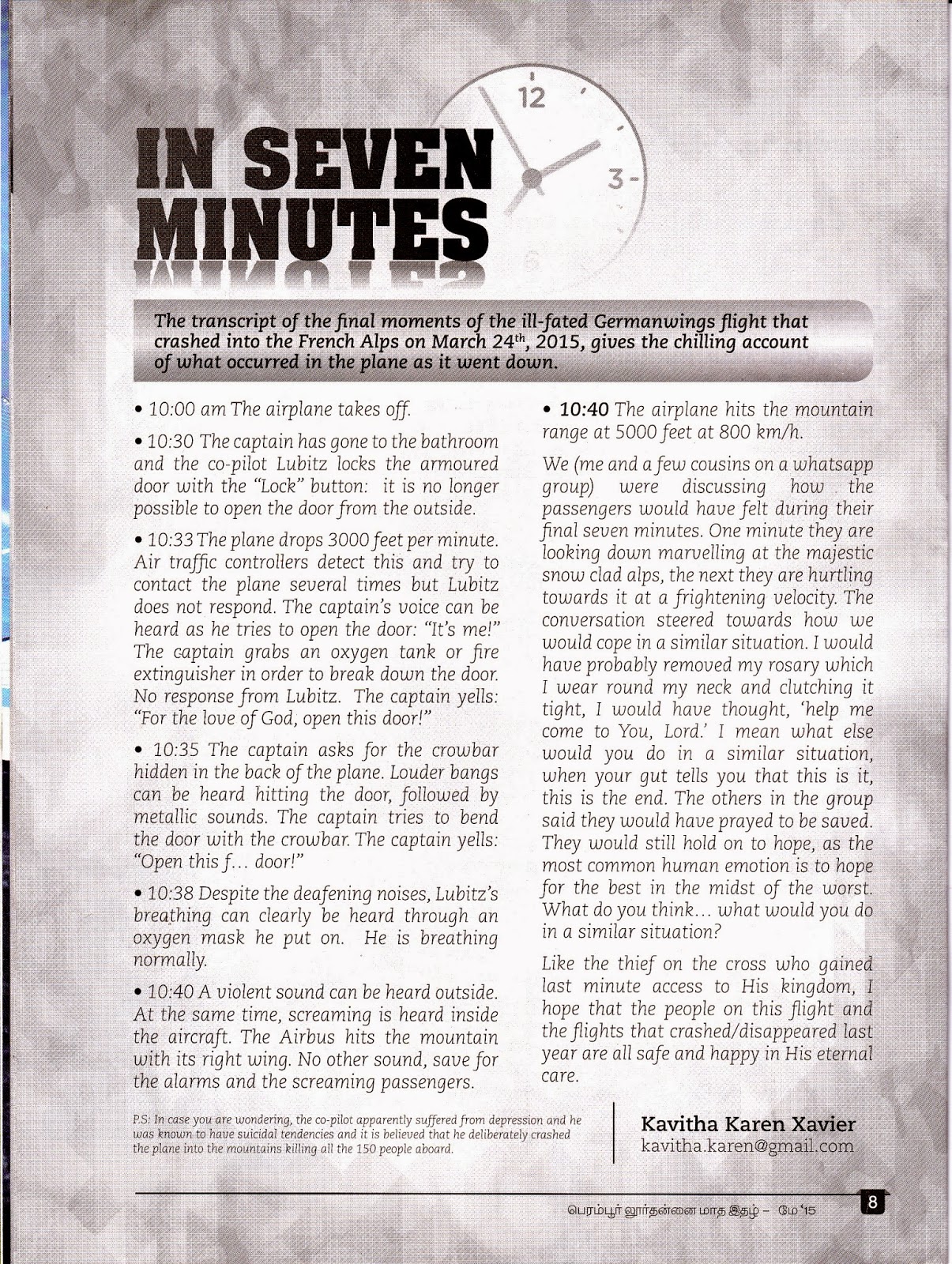 We (me and a few cousins on a whatsapp group) were discussing how the passengers would have felt during their final seven minutes. One minute they are looking down marvelling at the majestic snow clad alps, the next they are hurtling towards it at a frightening velocity. The conversation steered towards how we would react in a similar situation. One of the cousins said she would have probably removed her rosary which she wears round her neck and clutching it tight, she would have thought, ‘help me come to You, Lord.’ I mean what else would you do in a similar situation, when your gut tells you that this is it, this is the end. The others in the group said they would have prayed to be saved. They would still hold on to hope, cause the most common human emotion is to hope for the best in the midst of the worst. What do you think… what would you do in a similar situation?