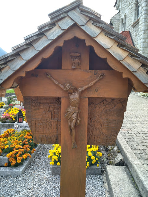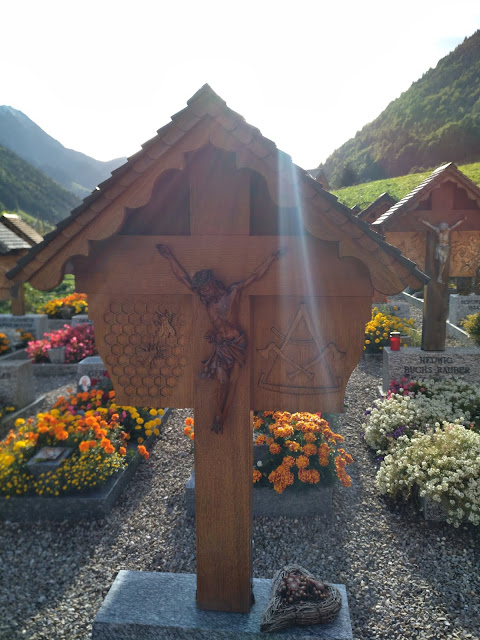 Apparently this form of marking the graves was brought about by Walter Cottier, who did not have enough money to erect a sculpted metal cross over the grave of his grandfather. So he thought of sculpting one from wood, and that’s how this tradition caught on. And you can see it here, in his grave… he is depicted as sculpting a cross, and he is the architect of many these crosses that decorate the graves of many people in his little town.