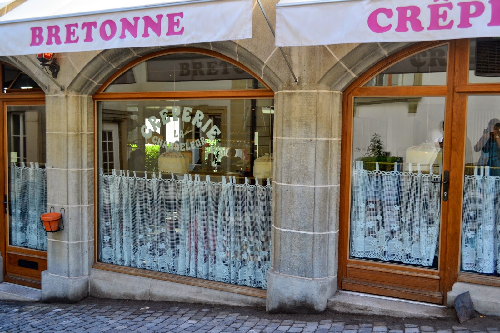 Nice lace curtains at a creperie place… see how the cobbled street goes uphill here.