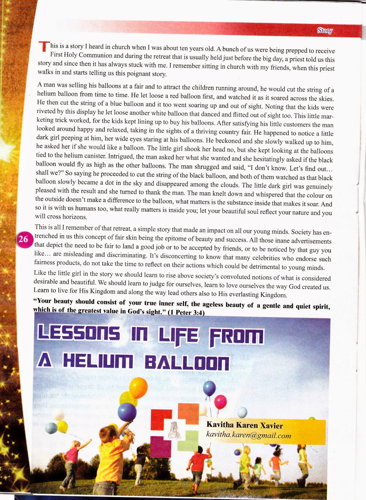 A man was selling his balloons at a fair and to attract the children running around, he would cut the string of a helium balloon from time to time. He let loose a red balloon first, and watched it as it soared across the skies. He then cut the string of a blue balloon and it too went soaring up and out of sight. Noting that the kids were riveted by this display he let loose another white balloon that danced and flitted out of sight too. This little marketing trick worked, for the kids kept lining up to buy his balloons. After satisfying his little customers the man looked around happy and relaxed, taking in the sights of a thriving country fair. He happened to notice a little dark girl peeping at him, her wide eyes staring at his balloons. He beckoned and she slowly walked up to him, he asked her if she would like a balloon. The little girl shook her head no, but she kept looking at the balloons tied to the helium canister. Intrigued, the man asked her what she wanted and she hesitatingly asked if the black balloon would fly as high as the other balloons. The man shrugged and said, “I don’t know. Let’s find out… shall we?” So saying he proceeded to cut the string of the black balloon, and both of them watched as that black balloon slowly became a dot in the sky and disappeared among the clouds. The little dark girl was genuinely pleased with the result and she turned to thank the man. The man knelt down and whispered that the colour on the outside doesn’t make a difference to the balloon, what matters is the substance inside that makes it soar. And so it is with us humans too, what really matters is inside you; let your beautiful soul reflect your nature and you will cross horizons.