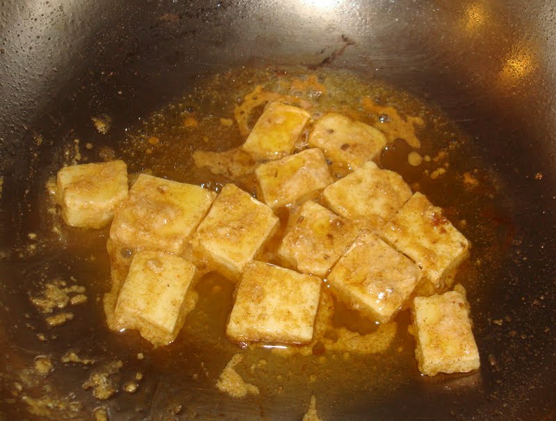 Now shallow fry only the paneer pieces in oil, till they get a slightly brown tint at the edges. Save the yogurt masala paste leftover in the bowl to use in the gravy.