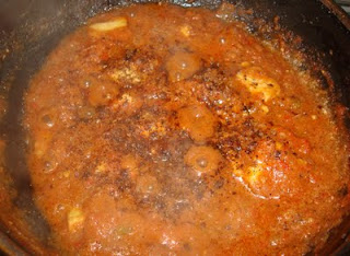 The gravy would have attained a deeper red colour by now, be generous and pour in some fresh cream. In case you don’t have fresh cream handy, pour in some thick yogurt. While pouring the yogurt, its better to first transfer the pan to the other unlit stove and drop in a spoonful at a time, mixing after each addition, so that the yogurt doesn’t curdle and form white specks in the gravy. [Check if the salt and hotness quotient is okay, if not, add necessary salt and chillie powder.]