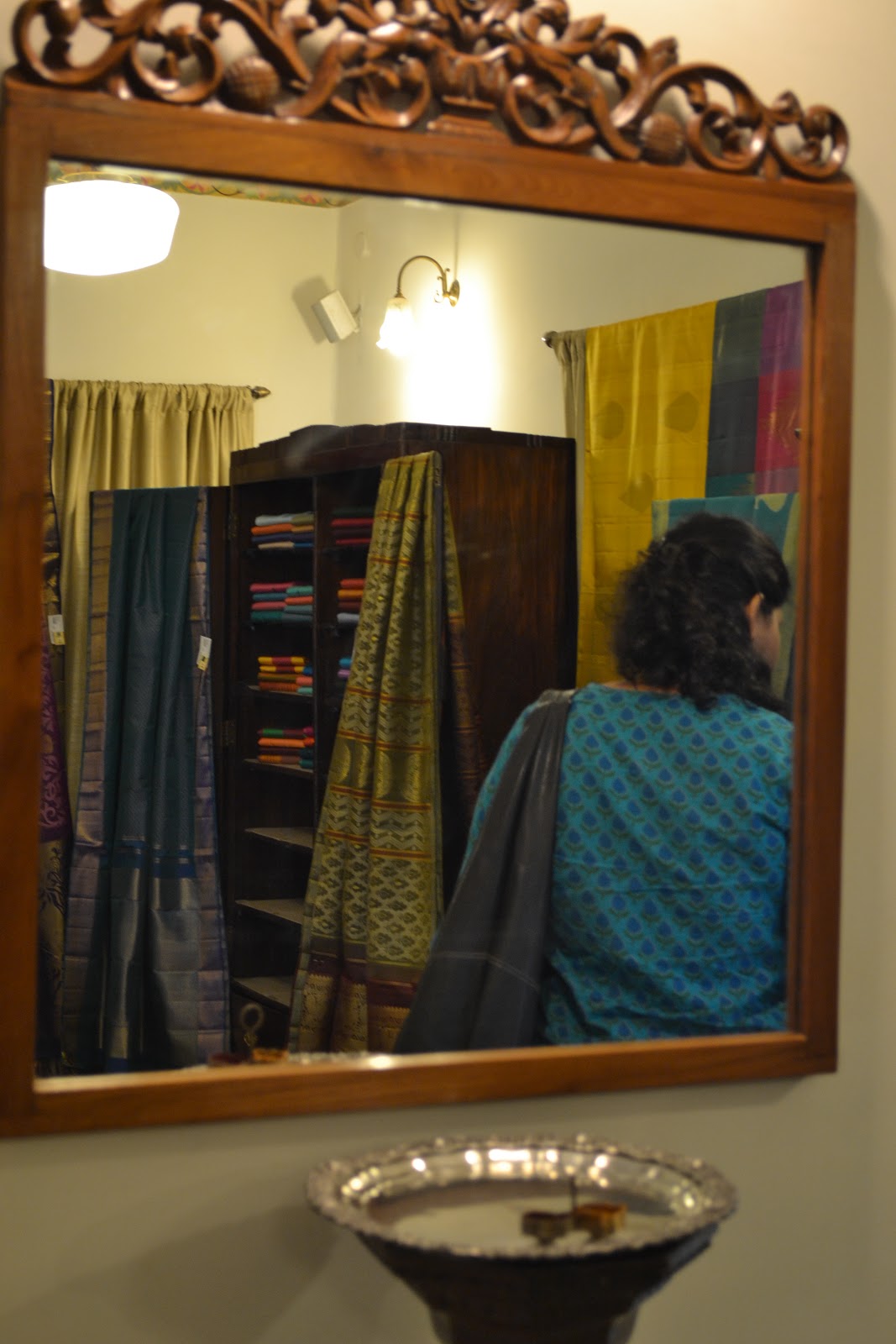 See what I mean… about the ads, nicely done. So we decided to check them out… and we were pleasantly surprised. This isn’t your ordinary shop, it’s a tastefully decorated house that has sari’s in various hues draped all over the place. And the collection they have is pretty good, of course it’s mostly for grand occasions… and the prices go up as you move from room to room.