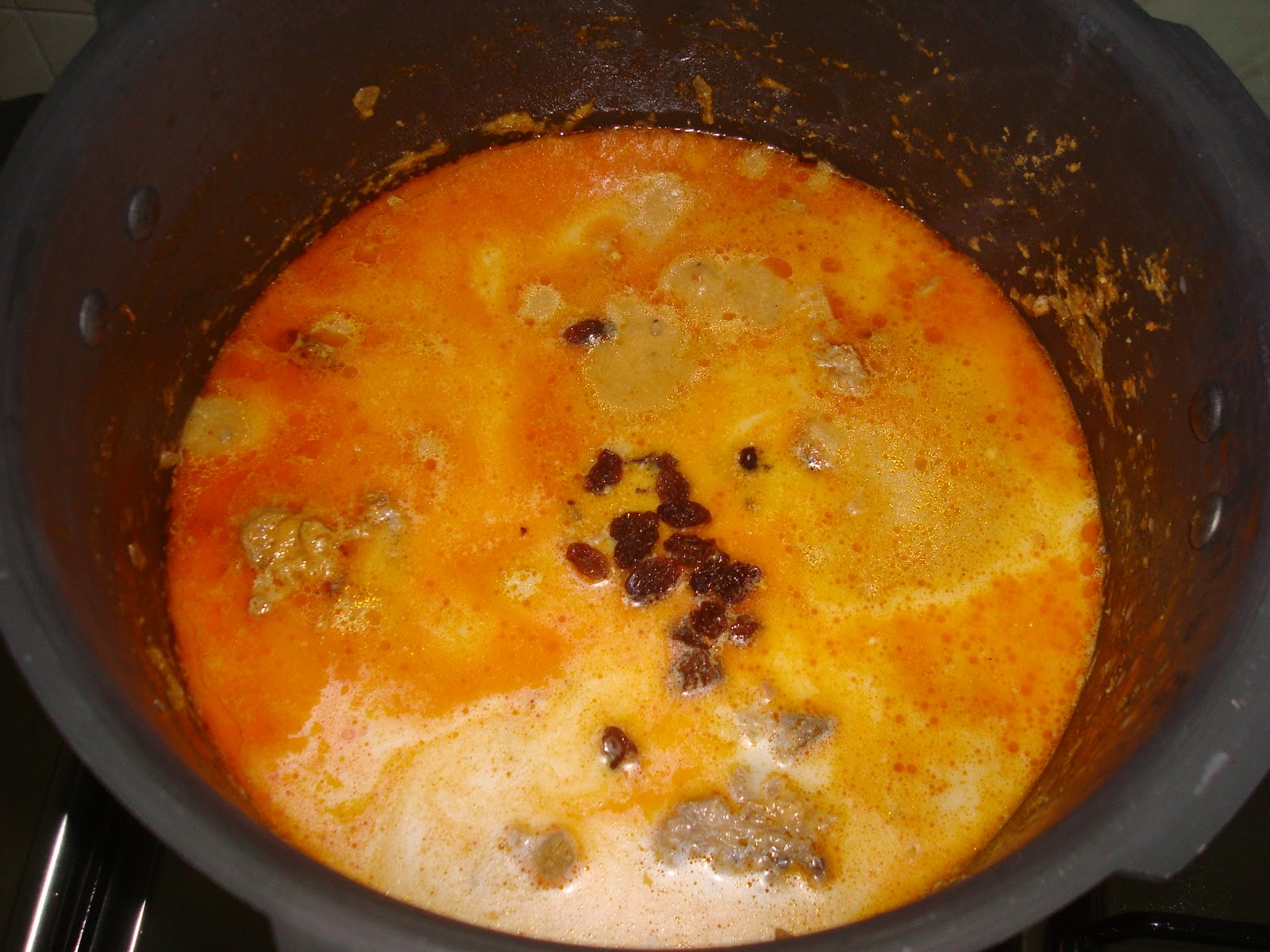 Now add whisked yogurt, bout half a cup and mix it up well. Then add appropriate quantity of water, salt and pressure cook till the meat is tender (bout three whistles time).