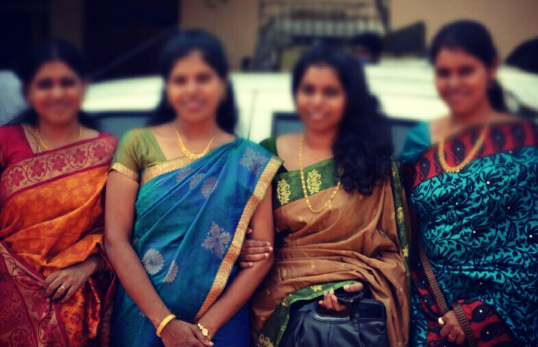 Other than these troubling customs, weddings are a colourful sight here. Everybody looks quite nice in their silk sarees with flowers in the hair. The silk saree is a gorgeous six yard material that drapes the body beautifully and lends an old world charm and elegance to the wearer. I rather like getting decked up for a wedding and hanging out with the cousins. Here’s a picture of me and the cousins at a recent wedding… I like how our saree colours stand out.