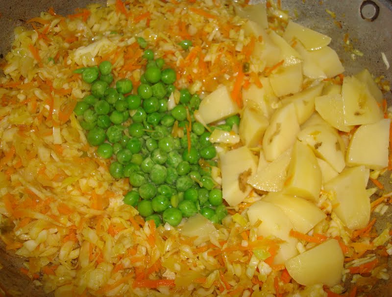 Now drop in the peas and the cooked potatoes and fry them around. (If you have capsicum, add them now..)