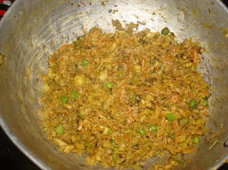 So getting stared, finely chop some onions, a few green chillies and an inch or two of ginger. Then rummage through your fridge and remove all the vegetables you can use in a cutlet, like carrots, cabbage, potato, peas, capsicum and the leafy herbs like coriander and mint. I hope you know that its not necessary to use all the vegetables/herbs mentioned here, use whatever you have. I usually grate the carrots, saves the hassle of having to cook it separately. Finely chop or grate the cabbage too. Roughly cube your potatoes and cook them separately. Wash and chop your leafy herbs.