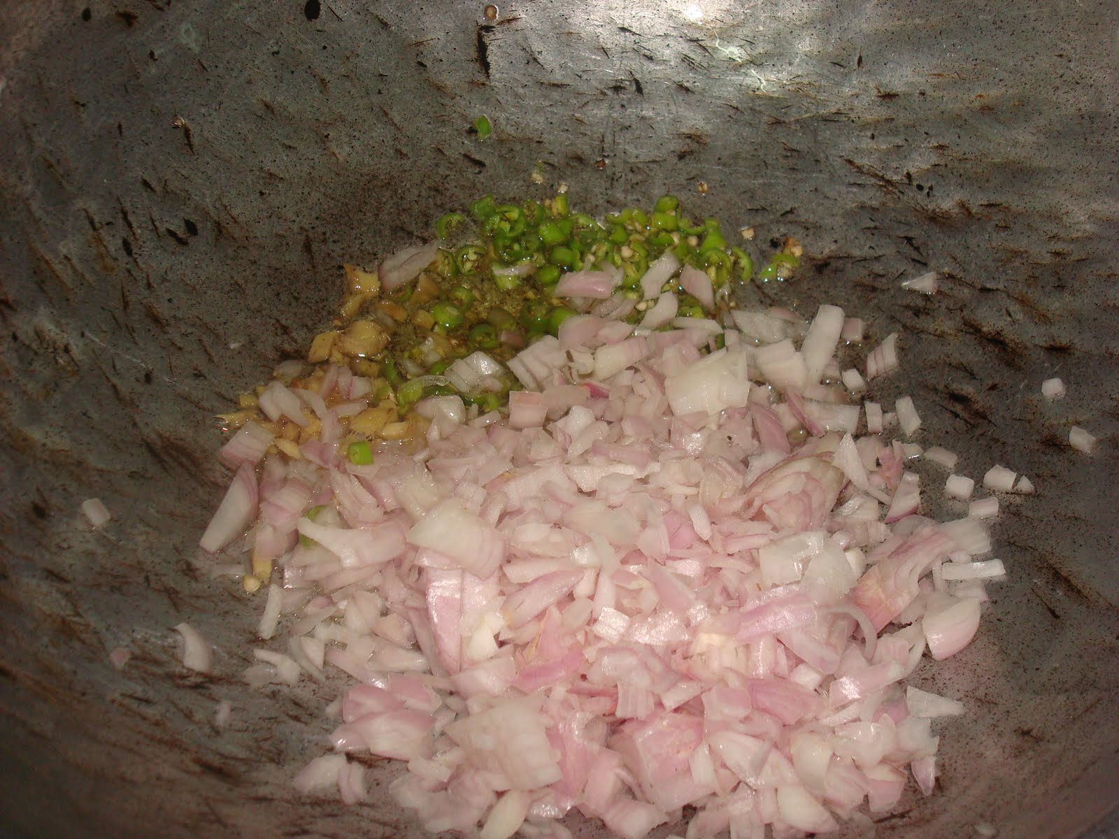 Now in a large kadai heat a few tablespoons of oil, and drop in the chopped onions, green chillies and the ginger.