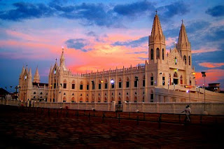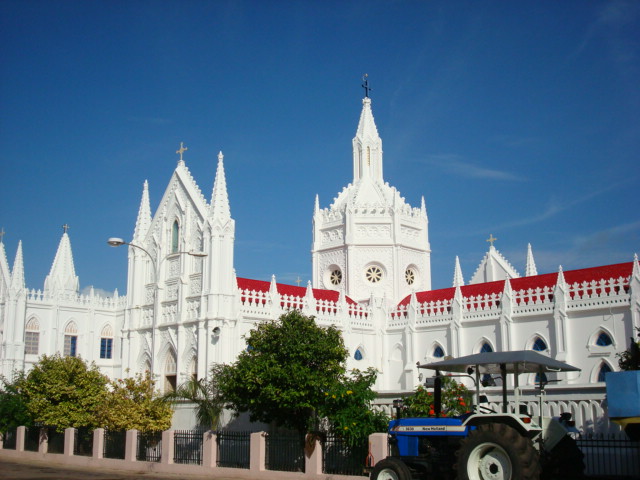 Somewhere in the 17th century, a few Portuguese merchants were caught in the midst of a raging cyclone near the coast of Bay of Bengal. Their ship got wrecked and they were starting to lose hope when they saw an apparition of the Blessed Virgin holding her divine infant in her arms… they were astounded by this sudden appearance in the middle of the ocean and as they watched she guided them safely to dry land. These merchants landed in an obscure little place called Velankanni and they learnt that the Virgin Mary had appeared two more times in the same village during the 16th century, once to a crippled boy whom she cured and this other time to a Hindu brahmin boy who was resting near a pond with a pot of milk. She asked the Hindu kid a little milk for her son and the boy complied and today this place is called Our Lady’s Pond. The Portuguese merchants then proceeded to erect a shrine to the Blessed Mother out of gratitude and  devotion,   they sculpted a statue of her in the image of the apparition and to this very day the statue holds a very sacred place in the Basilica. Legend has it that many decades ago during the church festival, while the faithful were carrying this statue of Mother Mary on a procession round the hamlet she suddenly disappeared… apparently the statue vanished into thin air and reappeared in the Basicila. The same thing happened next year and since then the statue has never been removed from the church. Millions of people visit Velankanni every year and Our Lady has been known to bestow her graces and miracles on the faithful. She is called Our Lady of Health cause she healed the crippled boy and people from all over the world go to her with various ailments and she cures them. The basilica itself is pretty awesome… here are a few pictures.